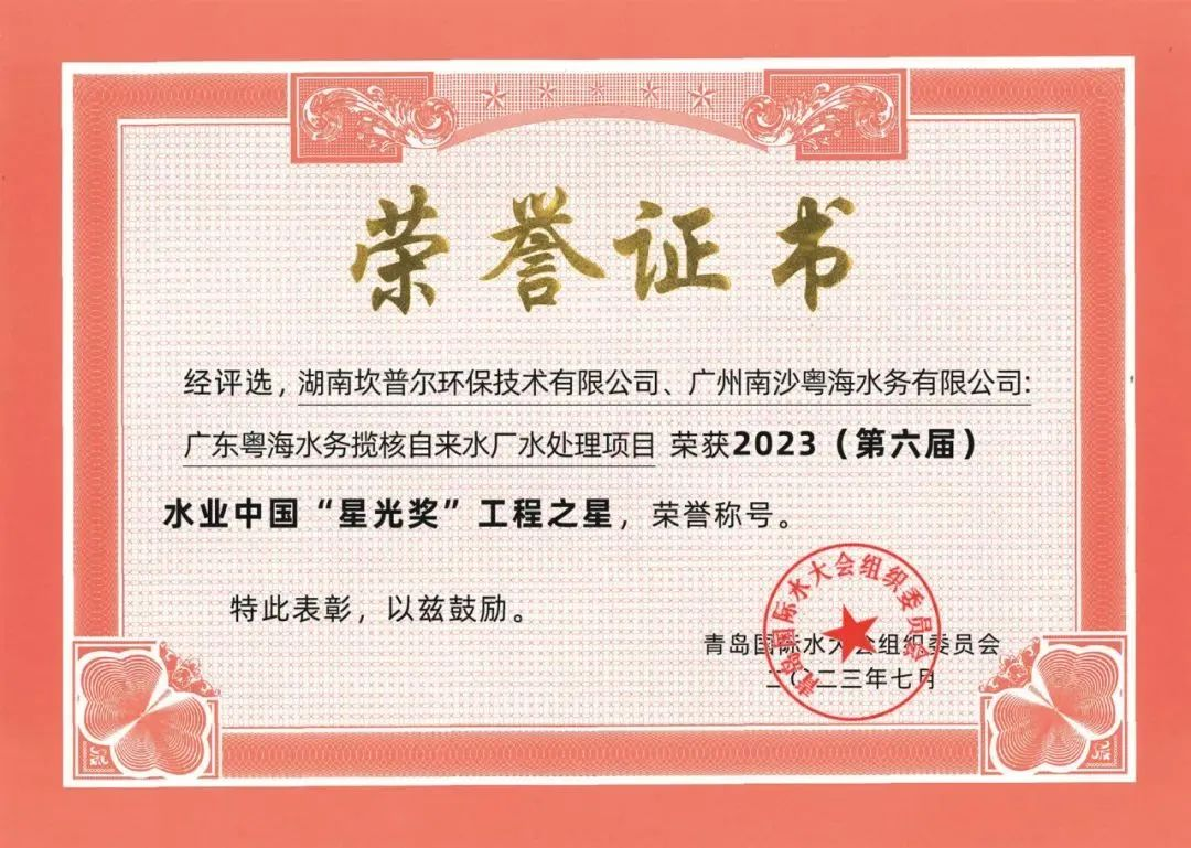 荣誉盛典现场,水业中国星光奖等评选颁奖如期举行。由坎普尔参与承建的广州南沙粤海水务有限公司旗下广东粤海水务榄核自来水厂水处理项目经过多方评选投票,荣获“2023(第十八届)水业中国星光奖-工程之星的荣誉。