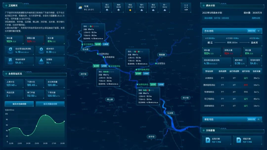 HZInfo3000闸泵集群智能管控系统通过流域地形、气象、水文等数据结合流域枢纽的运行调度规程以及运行数据对流域的来水态势进行预报和预警,以流域泵站闸站群的调度方案为核心,基于GIS结合流域和枢纽的调度目标,并利用一二维水动力、水量平衡等数理模型对来水和枢纽调度进行预演,形成预案。该系统适应于流域洪水预报、洪水演进、水闸调度等场景,以自动控制与调度决策支持系统为核心,为防洪防潮、排涝及水环境调度指挥提供决策支持,实现对泵闸站群的防洪、排涝及改善水环境的优化调度。