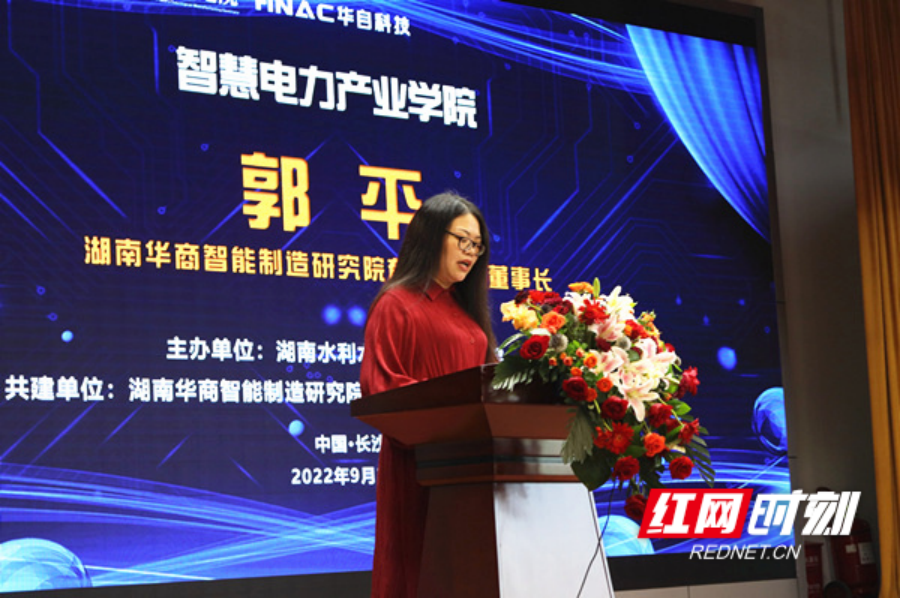 郭平发表讲话,她表达了华商智造院作为智能化集成服务商,在学校领导的指导下,与本土上市公司天行(中国)科技携手共建智慧电力产业学院的初心与决心。引导学生们做持续学习者、奋斗者。