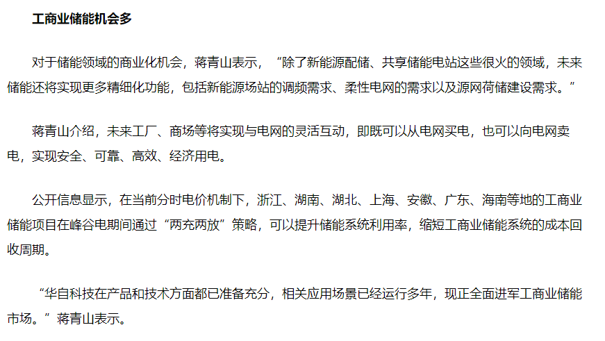 对于储能领域的商业化机会,蒋青山表示,除了新能源配储、共享储能电站等领域,储能还将实现更多精细化功能。未来工厂、商场等将实现与电网的灵活互动,既可以从电网买电,也可以向电网卖电,实现安全、可靠、高效、经济用电。