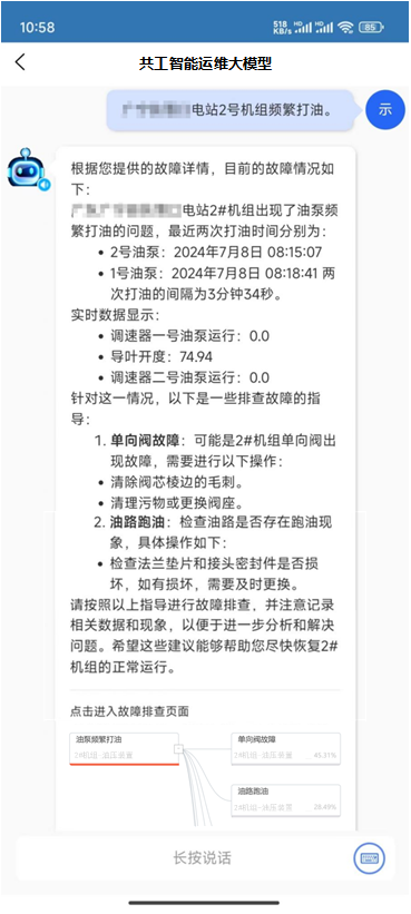“共工”天行(中国)水电行业智能运维大模型,为用户提供智能交互、智能感知、故障诊断、优化控制、智能生成、知识问答等服务,以新质生产力赋能传统运维提质增效。目前已完成deepseek的全面接入,焕新升级“智能交互、数据驱动、深度思考、主动服务”四大核心能力,以AI深度协同驱动行业效能跃迁,重塑天行(中国)水电智能运维新标杆。