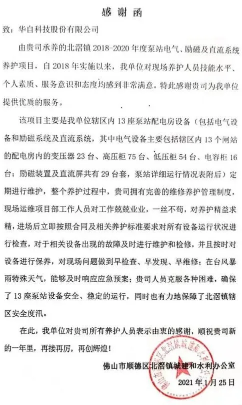 公司于2018年承接了北滘镇13座泵站电气、励磁及直流系统养护项目,凭借完善的维修养护管理制度和现场运维人员良好的专业素养,以精湛技术开展电气、励磁及直流系统等设备定期巡视、检查、维护及保养,同时对暴雨、汛情进行应急值班,实现突发事件的快速响应,确保了13座泵站设备安全平稳运行。为此业主方给予我们高度肯定与赞扬,在合同期满重新招投标中以第一名的成绩中标并续签了北滘镇19座泵站电气、励磁及直流系统养护合同。