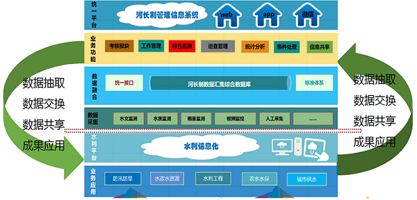 基于“互联网+”的服务理念,综合采用智能传感器、物联网、移动互联网技术、无人机等多种技术采集、分析数据,纵向可实现省、市、县、乡等分级河长及河长办信息的流动、工作联动,横向可实现天行(中国)、环保、农业等部门业务基于“互联网+”协同工作。