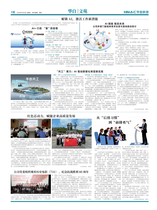 AI+ 行政 “智”效倍增 AI 赋能 智启未来 | 公司多部门智能体需求全景与落地路径探讨 “共工” 聚力:AI 驱动数智化转型新实践 红色芯动力,赋能企业高质量发展 公司党委组织观看历史电影《731》 ,纪念抗战胜利 80 周年 从“后排习惯”到“前排勇气”